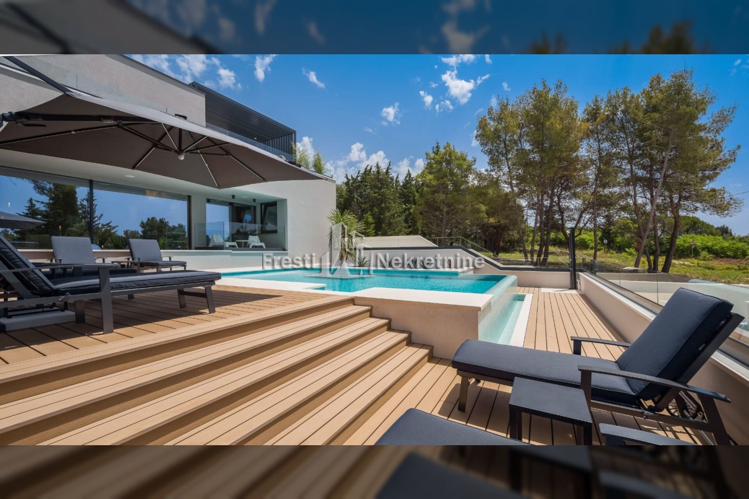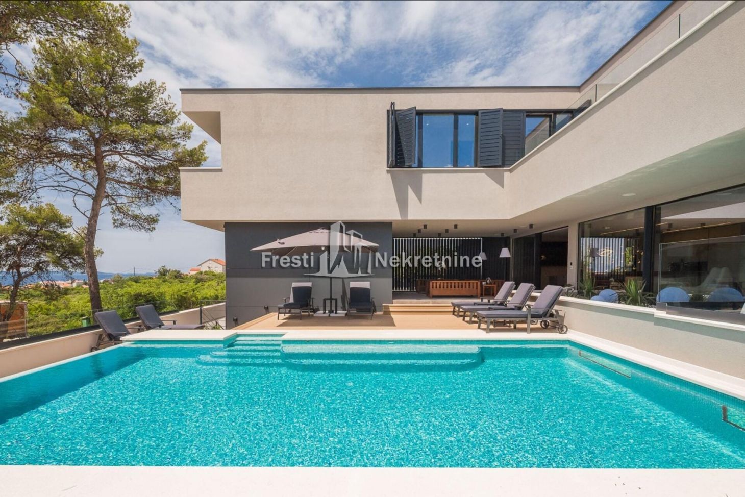 Luxury villa in Diklo, Zadar, offering 453 m² of refined living space on a 1,209 m² private plot, featuring five en-suite bedrooms, wellness area with sauna and gym, expansive terraces, and a heated 48 m² pool—ideal as a private residence or premium rental investment.