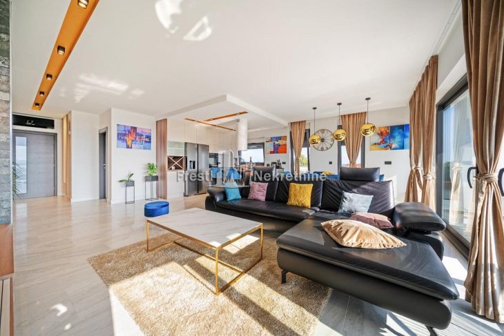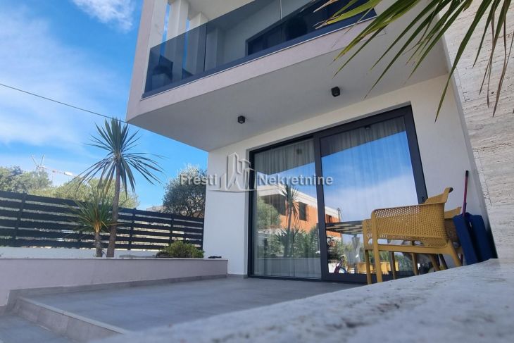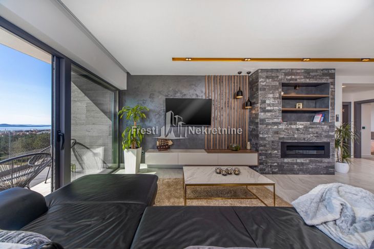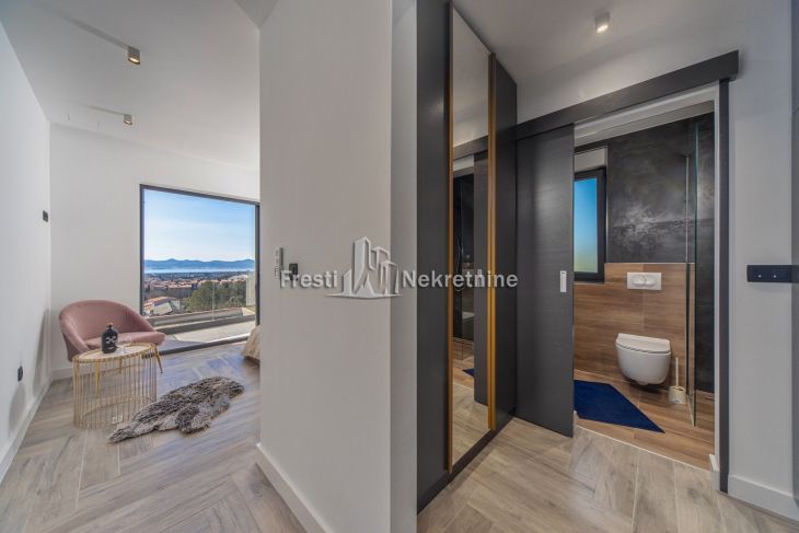 Modern villa on the outskirts of Zadar offering breathtaking panoramic views of the city, sea, and surrounding islands. The property spans 305 m² and includes two independent residential units with a total of five bedrooms, accommodating up to 12 guests. Features include spacious south-oriented terraces, a private gym, landscaped garden with a 32 m² pool, children’s playground, outdoor barbecue area, and four private secured parking spaces. Located just 2.5 km from the sea, the villa is ideal as a luxury residence or high-end tourist rental investment.