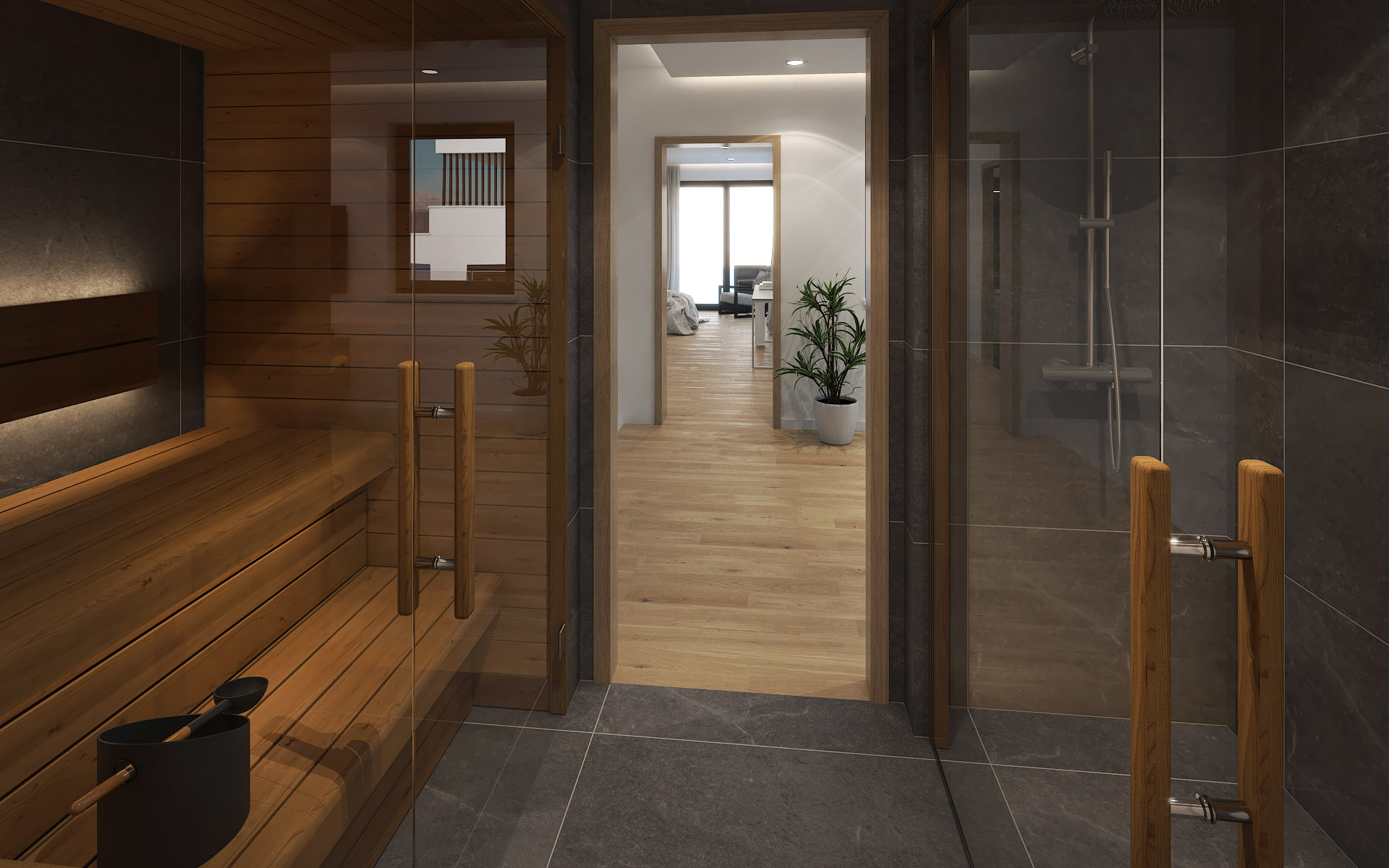 Room with private bathroom, sauna with shower area, separate toilet, social area, internal staircase and partially covered terrace with hydro massage bathtub and external living area.